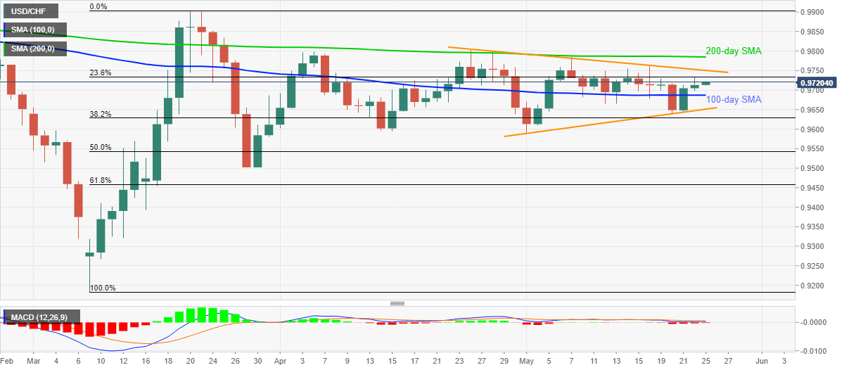 While extending its run-up past-100-day SMA, USD/CHF rises to 0.9720, up 0.08% on a day, during the early Monday.