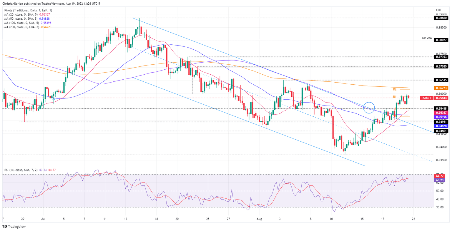 The USD/CHF advances for the six-straight day, on broad US dollar strength across the board, after breaking above the 20-day EMA at 0.9532 on Thursday. During the day, the USD/CHF hit a daily low at 0.9553, before climbing towards its daily high, shy of the 0.9600 figure, before settling at current exchange rates. At the time of writing, the USD/CHF is trading at 0.9587, up by 0.29%.