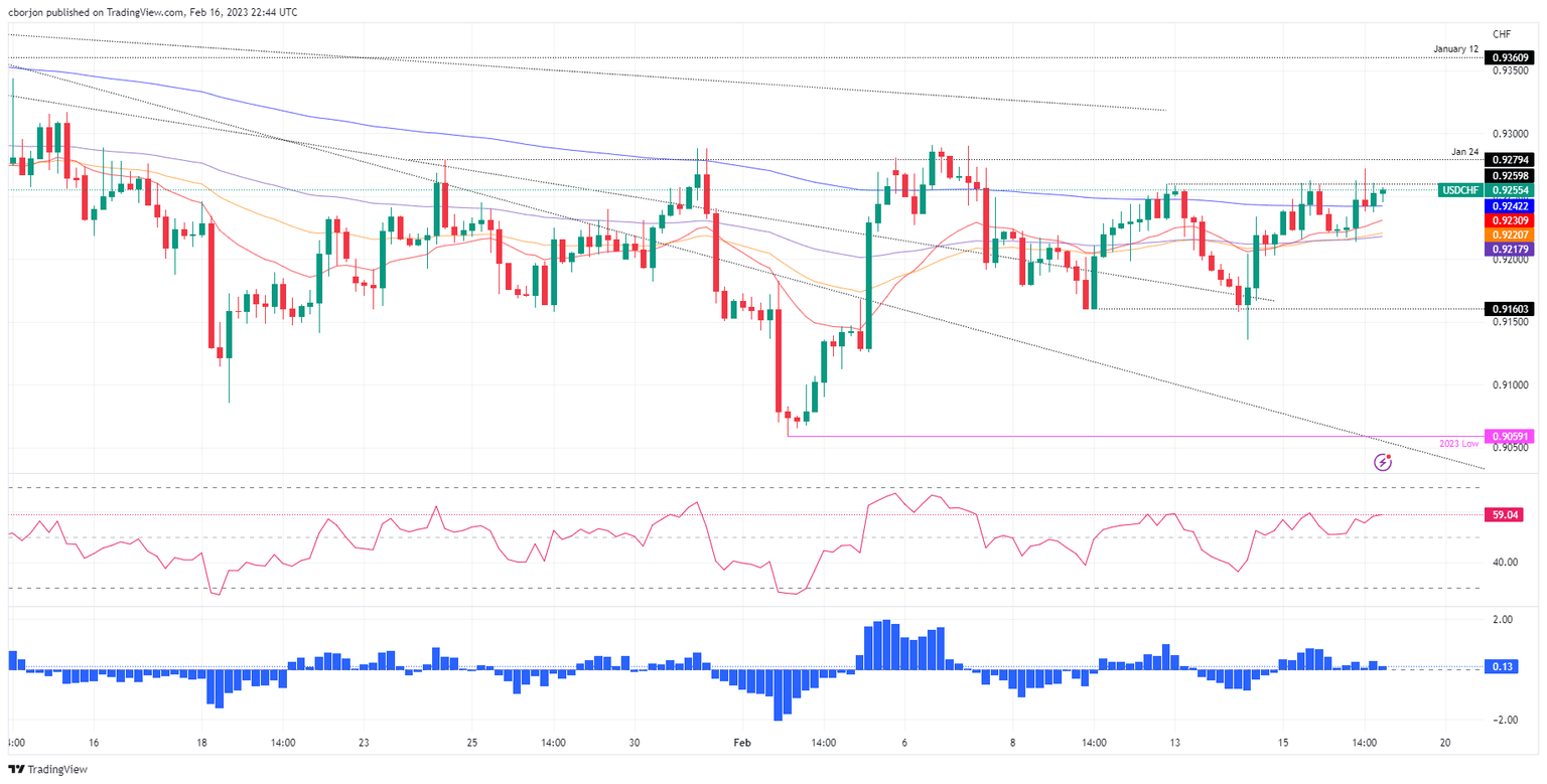 - USD/CHF is subdued but looms around the 50-day EMA, at around 0.9282.