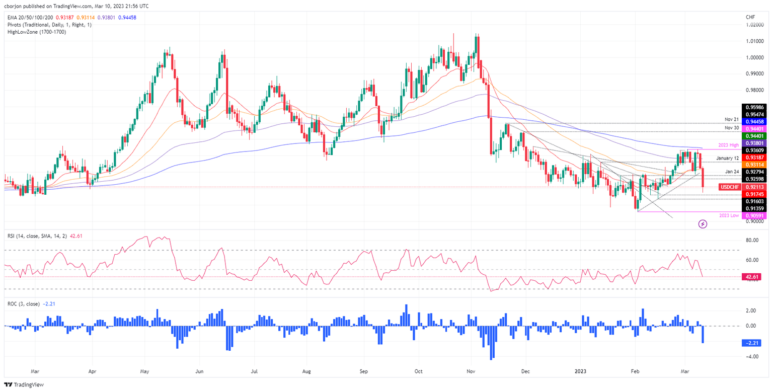 USD/CHF falls below the confluence of the 20 and 50-day Exponential Moving Averages (EMAs), extending its daily losses to more than 1% Friday. A mixed US jobs report weighed on the US Dollar (USD). Sentiment deteriorates on a US bank collapse, which could have spillover in the country. At the time of writing, the USD/CHF is trading at 0.9216.