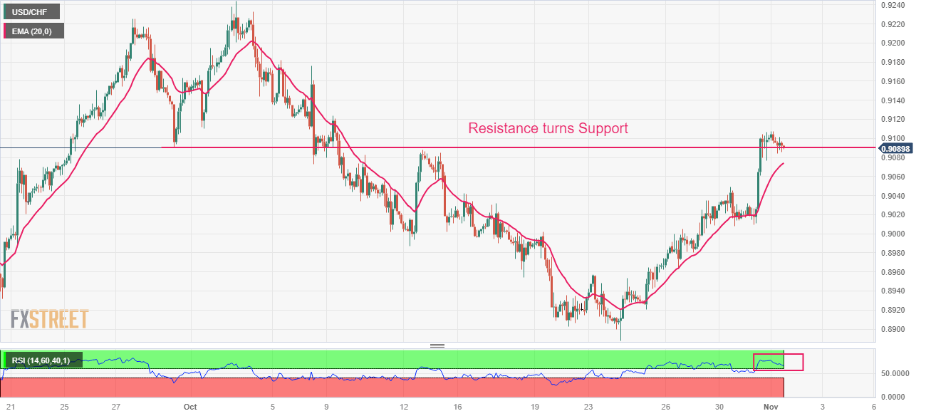 - USD/CHF aims to stabilize above the horizontal resistance plotted from 0.9090.