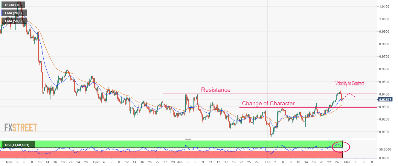 USD/CHF has corrected after struggling to extend recovery above the horizontal resistance placed from January 6 high around 0.9410. Earlier, the Swiss Franc asset delivered a breakout of the resistance plotted from January 31 high at around 0.9290, which resulted in a bullish reversal. The major is expected to display a volatility contraction pattern before printing a fresh upside.