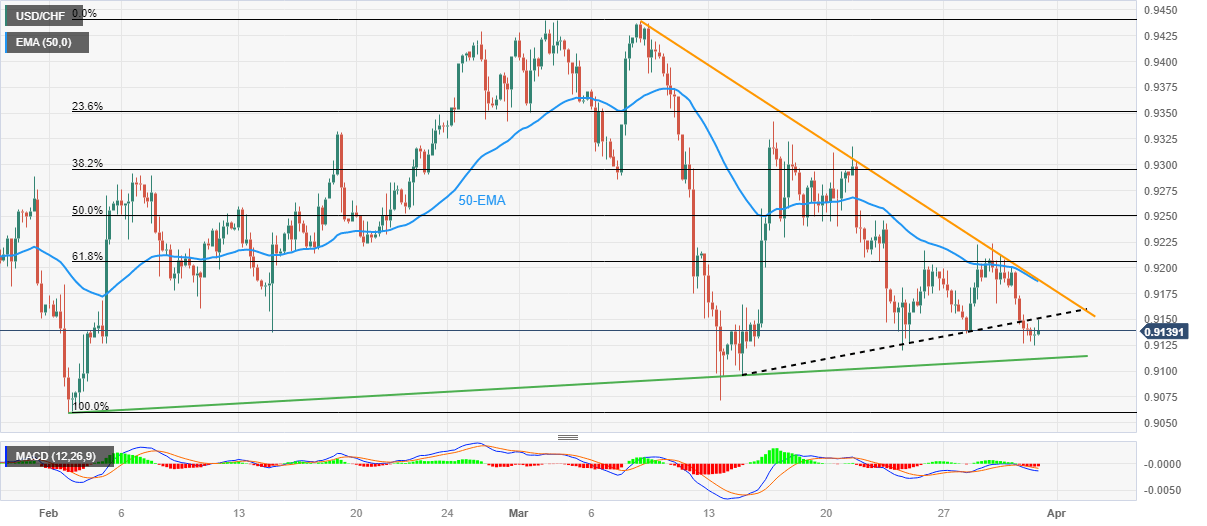 As a result, the Swiss currency pair sellers are well-set to challenge an upward-sloping support line from early February, around 0.9110 by the press time.