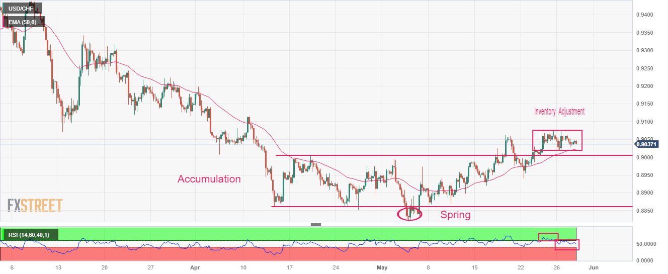 USD/CHF is demonstrating an inventory adjustment phase after delivering a breakout of the Wyckoff Accumulation pattern formed on a four-hour scale. Broadly, the Swiss franc asset is expected to display wider bullish ticks and heavy volume as bulls remain solid in the markup phase. Upward-sloping 50-period Exponential Moving Average (EMA) at 0.9024 is providing support to the US Dollar bulls.