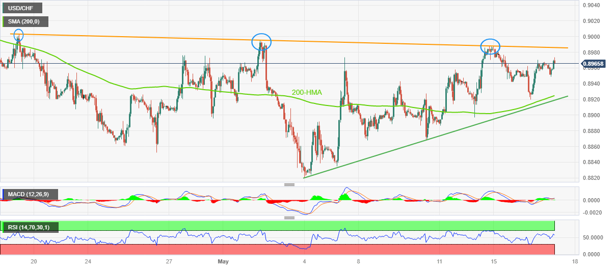 In doing so, the Swiss Franc (CHF) pair cheers sustained trading above the 200-Hour Moving Average (HMA) amid bullish MACD signals and upbeat RSI (14), not overbought. However, the RSI (14) has limited room towards the north before hitting the overbought territory, which in turn highlights a downward-sloping resistance line from April 19, close to 0.8990 at the latest, as the short-term key resistance.