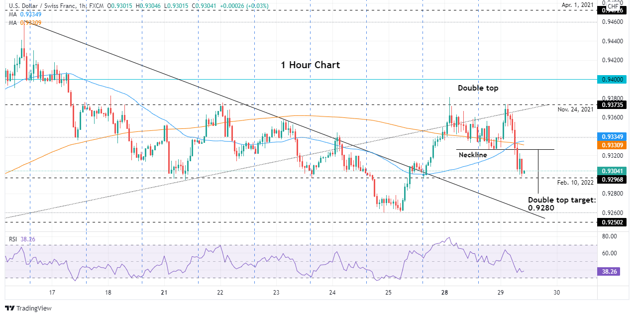 - USD/CHF Price Forecast: Upward biased in the daily chart, but a double top in the hourly chart, suggest a correction towards 0.9280.