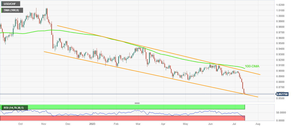 In doing so, the Swiss Franc pair drops for the seventh consecutive day while refreshing the multi-year low. However, the oversold RSI conditions join the bottom line of a downward-sloping trend channel established in December 2022, around 0.8570, to challenge the USD/CHF bears.