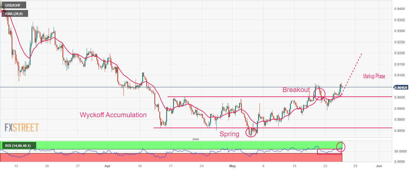 USD/CHF has entered into a markup phase after delivering a breakout of the Wyckoff Accumulation pattern formed on a four-hour scale. The Swiss franc asset is expected to display wider bullish ticks and heavy volume as bulls remain solid in the markup phase. Upward-sloping 20-period Exponential Moving Average (EMA) at 0.9000 is providing support to the US Dollar bulls.
