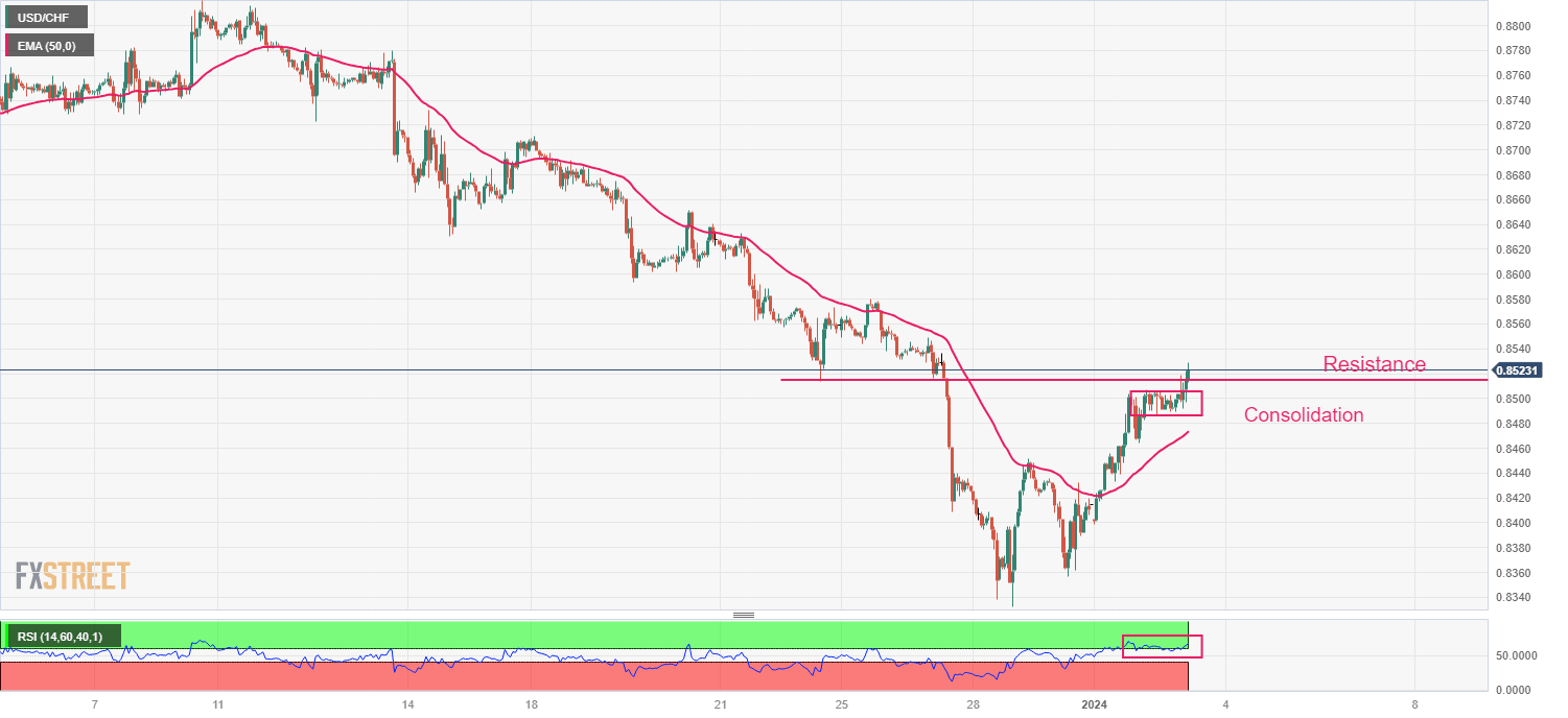 The USD/CHF pair delivers a decisive break above the psychological resistance of 0.8500 in the European session. The Swiss franc asset has extended its recovery to near 0.8520 amid a sharp rebound by the US Dollar Index (DXY) ahead of the Federal Open Market Committee (FOMC) minutes and the Manufacturing PMI data for December by the Institute of Supply Management (ISM).