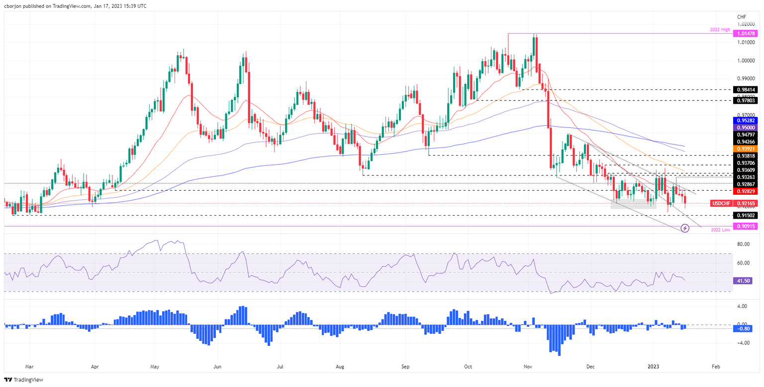 The USD/CHF is neutral-to-downward biased and continues to trade beneath the confluence of a three-month-old downslope trendline and the 20-day EMA. Although the bias suggests further downside, since December 2022, the USD/CHF bottomed around the February 2022 low of 0.9150 and remains unable to crack it. Therefore, bears need to clear the latter, to open the door towards 0.9100 first and then the 0.9000 figure.