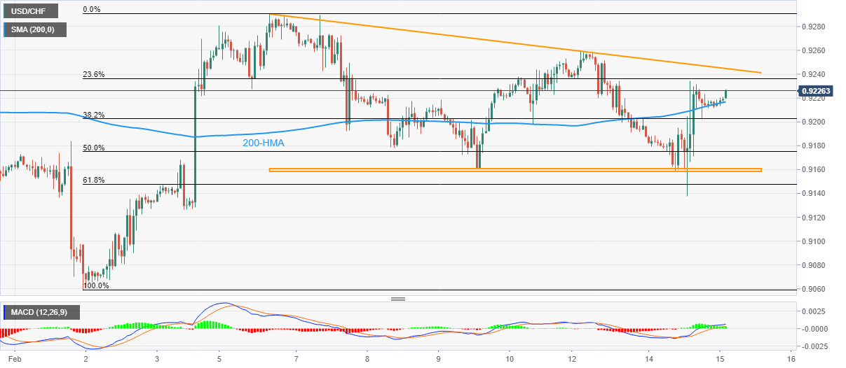 Adding strength to the upside bias is the quote’s latest bounce off the 200-Hour Moving Average (HMA), around 0.9215 by the press time, as well as the bullish MACD signals.
