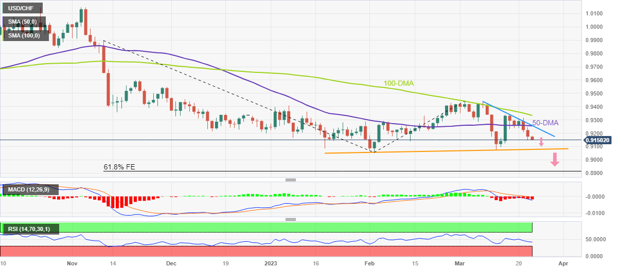 USD/CHF portrays a three-day downtrend at the lowest level in a week, down 0.25% intraday around 0.9155 heading into Thursday’s European session, as the pair sellers brace for the Swiss National bank (SNB) Interest Rate Decision.