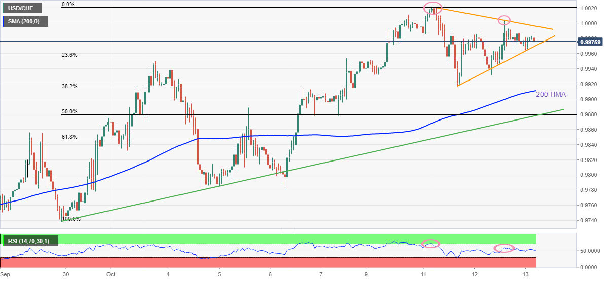 USD/CHF prints mild losses around 0.9975-80 as bears flex muscles inside a three-day-old triangle formation ahead of Thursday’s European session.