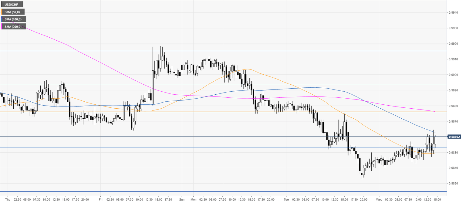 USD/CHF is trading below the 100 and 200 SMAs on the 30-minute chart suggesting a bearish bias. Resistance is seen at the 0.9877, 0.9897 and 0.9918 levels.
