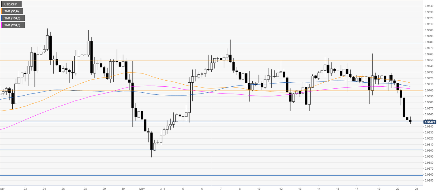 - USD/CHF is trading down while testing the 0.9650 support level.