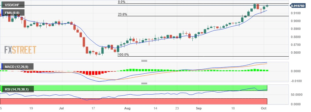 The current upward momentum in the pair suggests a bullish bias, with the 14-day Relative Strength Index (RSI) holding above the 50 level. The USD/CHF pair trades higher around the 0.9200 psychological level during the European session on Tuesday, followed by September’s high at the 0.9225 level.