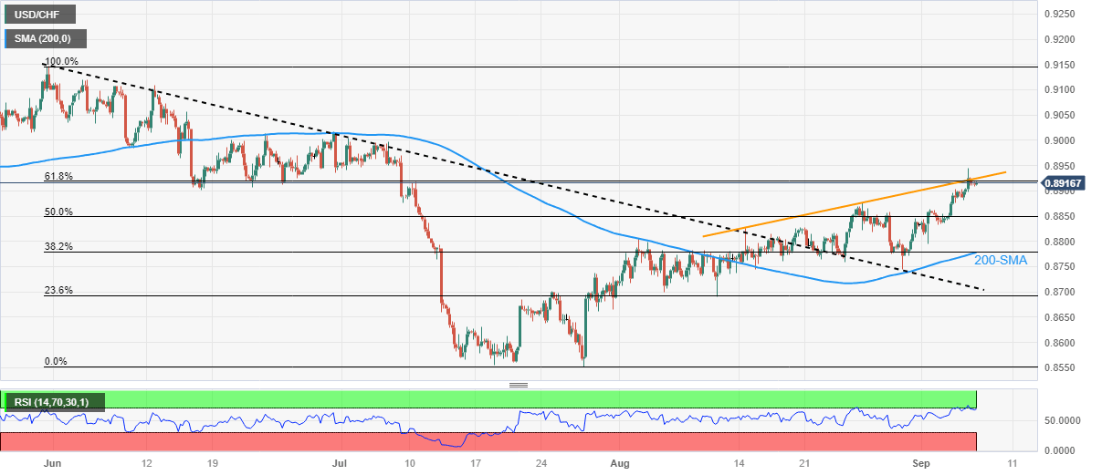 USD/CHF Price Analysis: Immediate resistance line prods bulls around 0.8930 amid overbought RSI