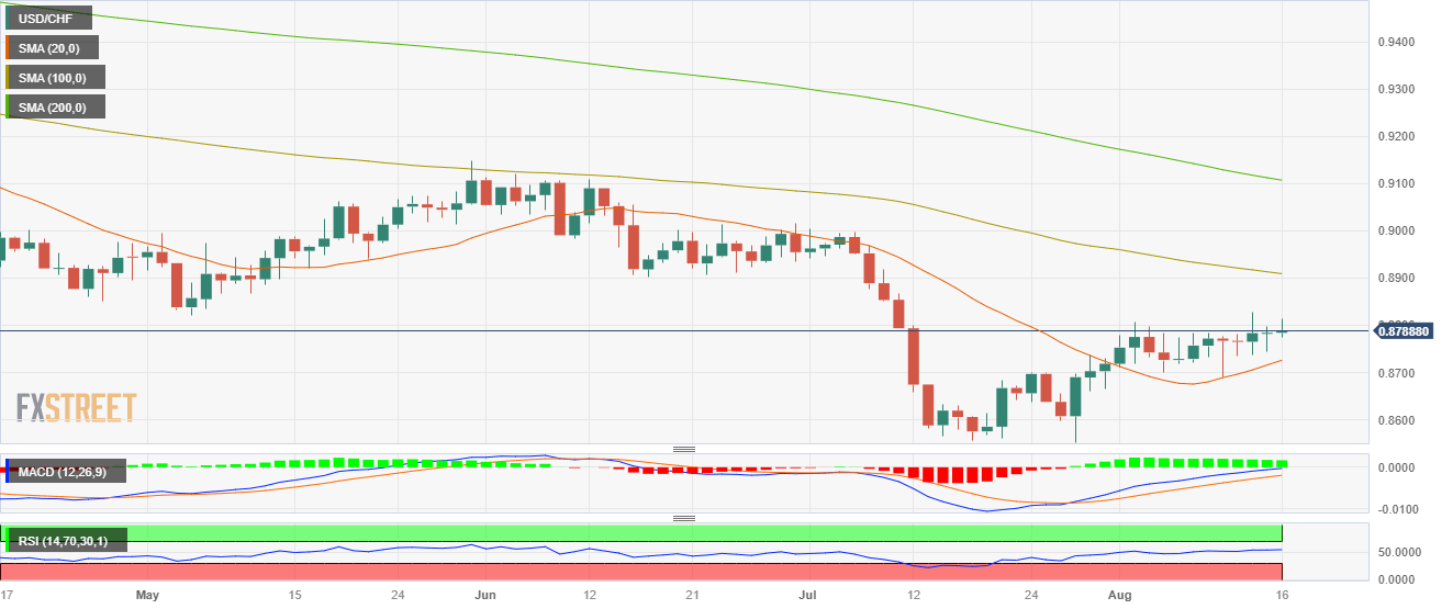 - USD/CHF trades with mild gains around 0.8790, tallying a third consecutive day of gains.