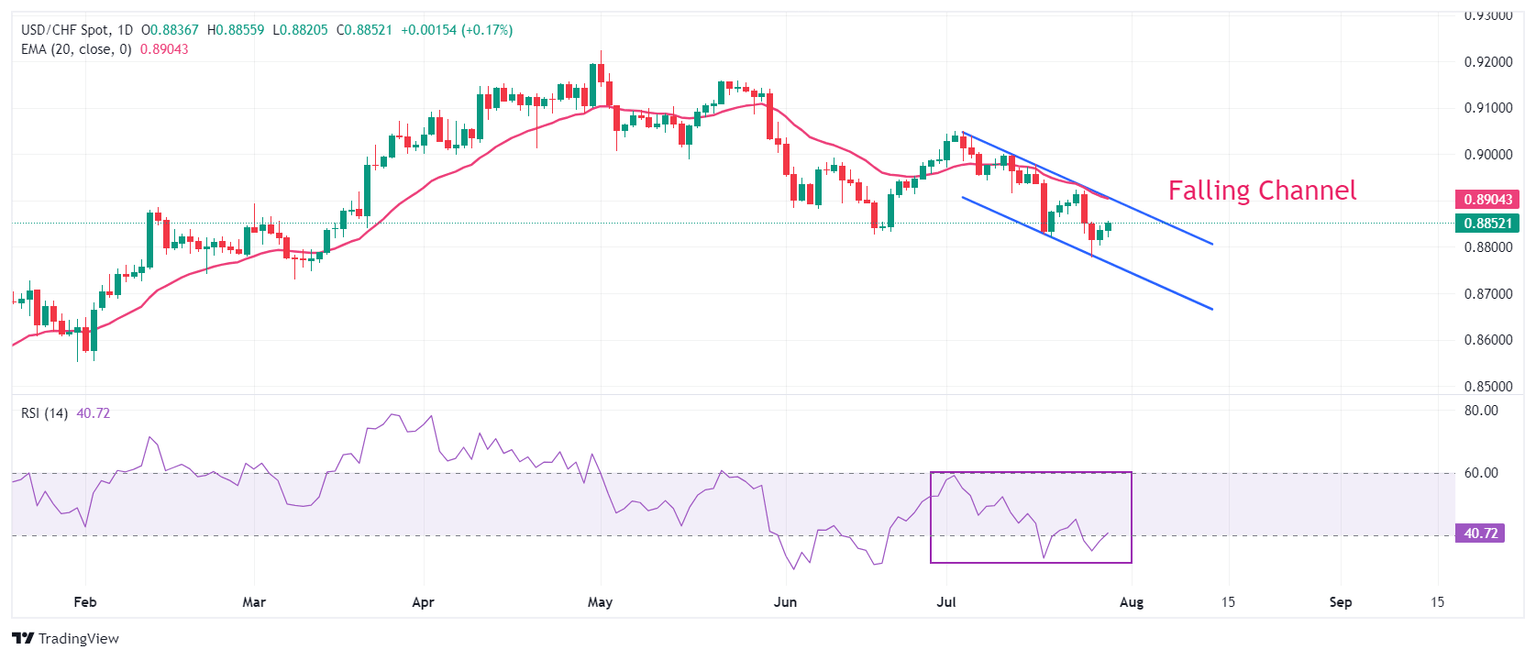 USD/CHF bounces back strongly from the lower boundary of the Falling Channel formation, on a daily timeframe, in which each pullback move is considered as selling opportunity by market participants. The 20-day Exponential Moving Average (EMA) near 0.8900 continues to act as major barricade for the US Dollar bulls.