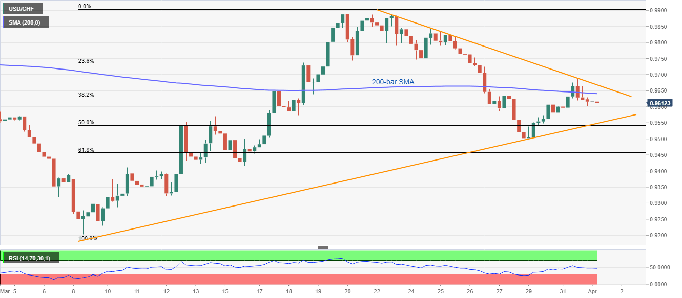 USD/CHF remains choppy between 0.9600 and 0.9630 ahead of the European session on Wednesday. In doing so, the quote remains below the short-term falling trend line and 200-bar SMA while also staying above an ascending support line since March 09.