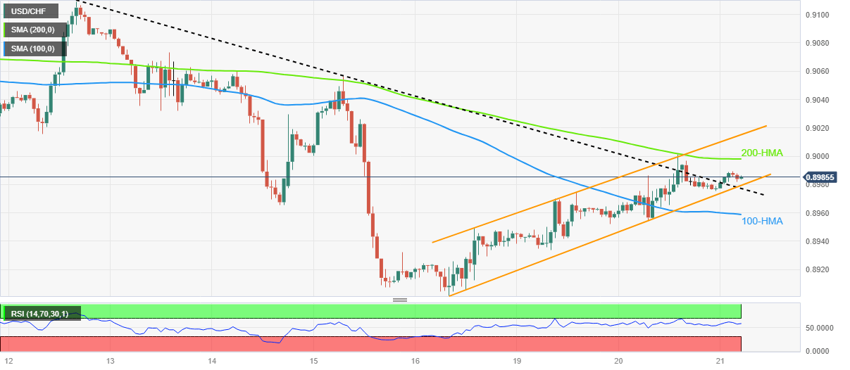 USD/CHF prints mild gains around 0.8990 as it remains firmer for the fourth consecutive day heading into Wednesday’s European session. In doing so, the Swiss Franc (CHF) pair seesaws inside an upward-sloping trend channel stretched from the last Friday.