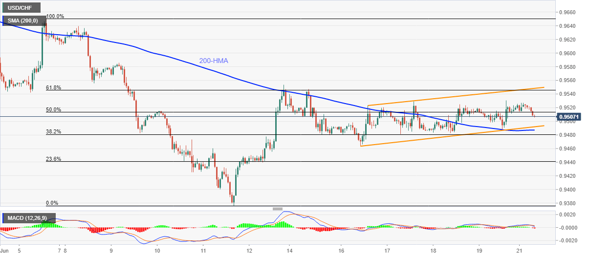 USD/CHF refreshes the intraday low to 0.9506 while heading into the European open on Monday. Even so, the pair stays inside an immediate upward sloping channel formation above 200-HMA.