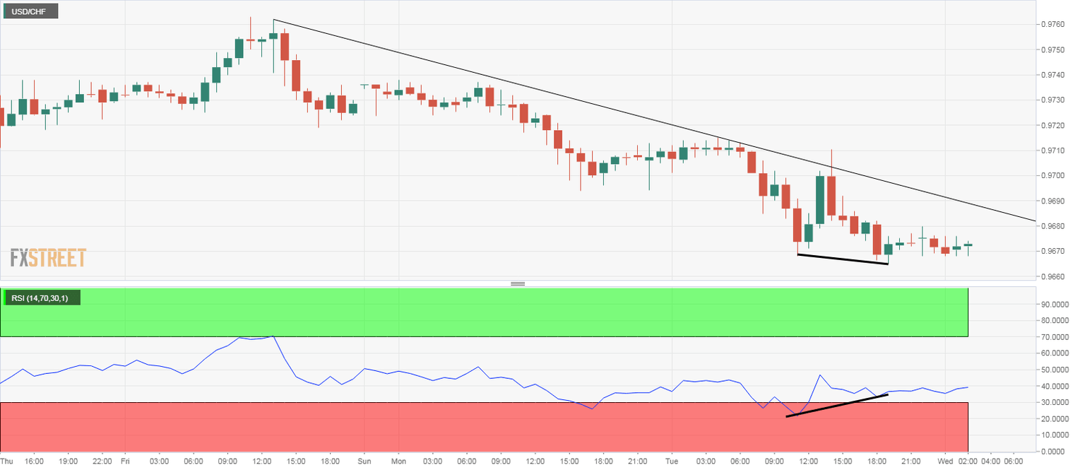 - USD/CHF's hourly chart shows a bullish RSI divergence.