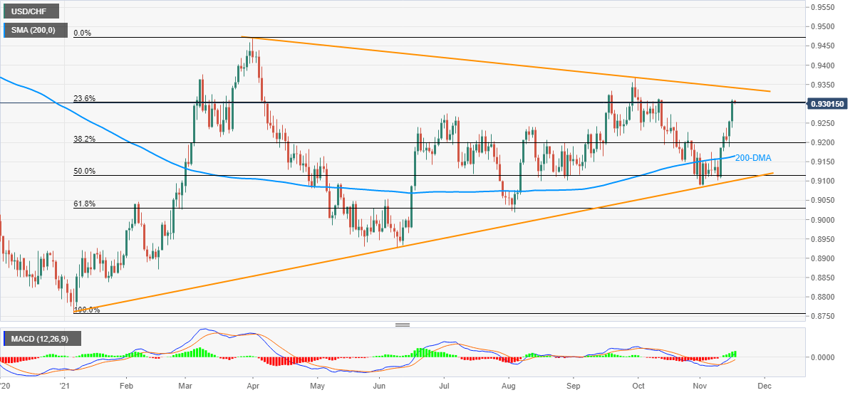 USD/CHF seesaws around 0.9300 following a two-day run-up towards the highest levels last seen on October 13.