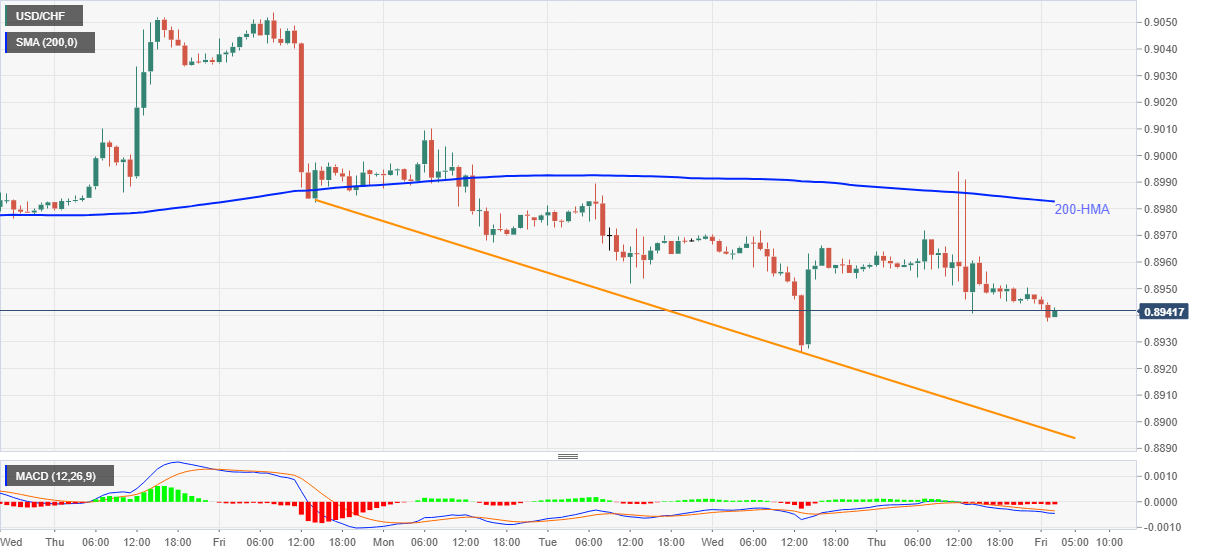 USD/CHF stays pressured around 0.8940 amid early Friday. In doing so, the Swiss currency (CHF) pair keeps trading under the 200-HMA while fading Wednesday’s bounce off February 17 low.