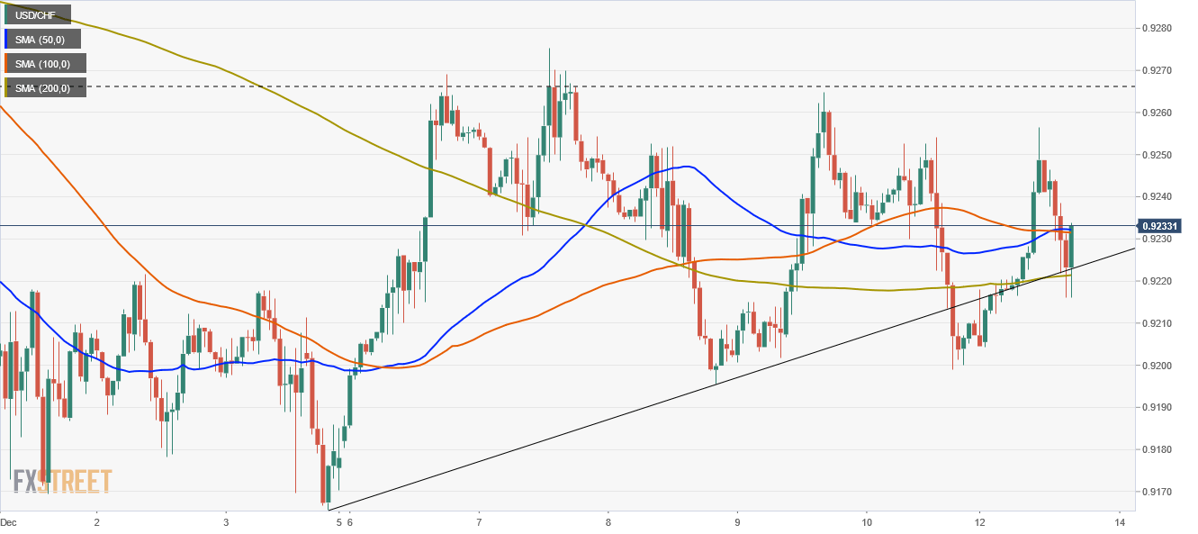 The USD/CHF hourly chart depicts that the pair has a neutral bias. At the time of publication, the spot price is approaching an upslope trendline around the 0.9210-15 region, a support level that, in the case of giving way, could send the pair towards the December 9 cycle low at 0.9191.