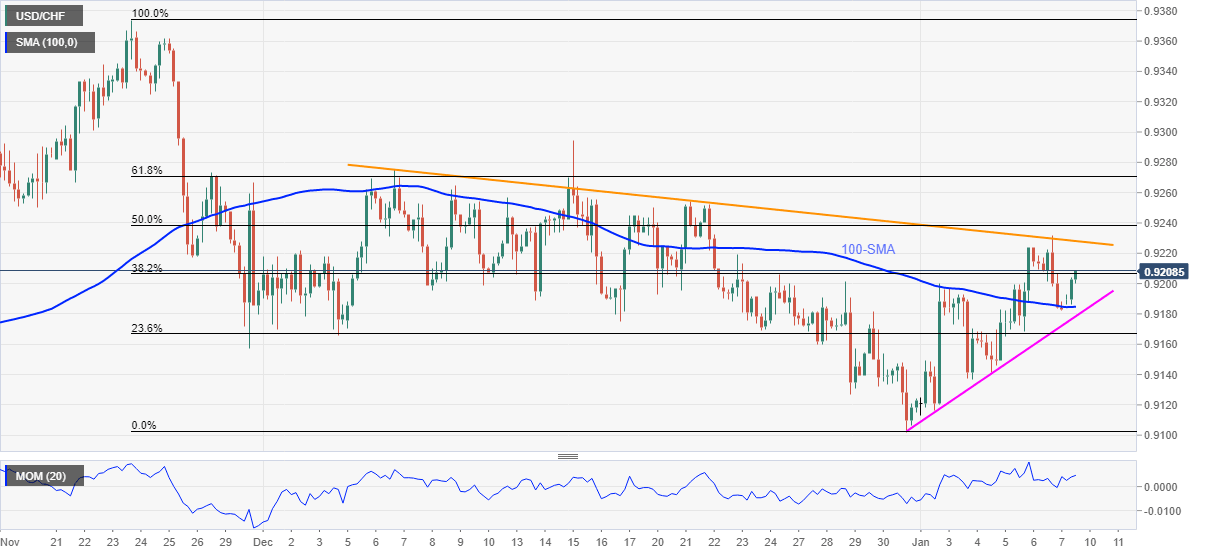 USD/CHF Price Analysis: Rebounds from 100-SMA to pierce 0.9200