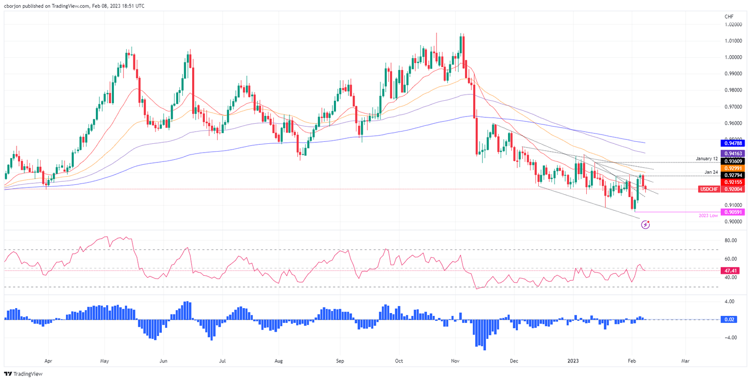 The USD/CHF drops for two consecutive days, though buyers are reclaiming the February 7 daily low of 0.9191, as they are eyeing to reclaim the 50-day EMA at 0.9299. At the time of writing, the USD/CHF exchanges hands at around 0.9200.