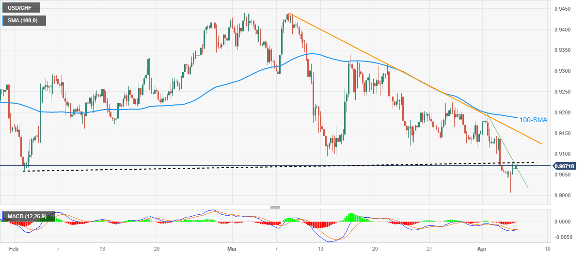 USD/CHF lures buyers around 0.9075 as it pierces a downward-sloping resistance line from Monday amid early Thursday in Europe. In doing so, the Swiss Franc (CHF) pair extends the previous day’s recovery moves from the lowest levels since June 2021 amid a sluggish session.