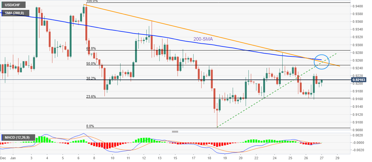 USD/CHF grinds higher past 0.9200, mildly bid while extending the previous day’s rebound from the week’s low during early Friday. In doing so, the Swiss currency pair rebounds from the 23.6% Fibonacci retracement level of its January 06-18 downside, near 0.9160 by the press time.