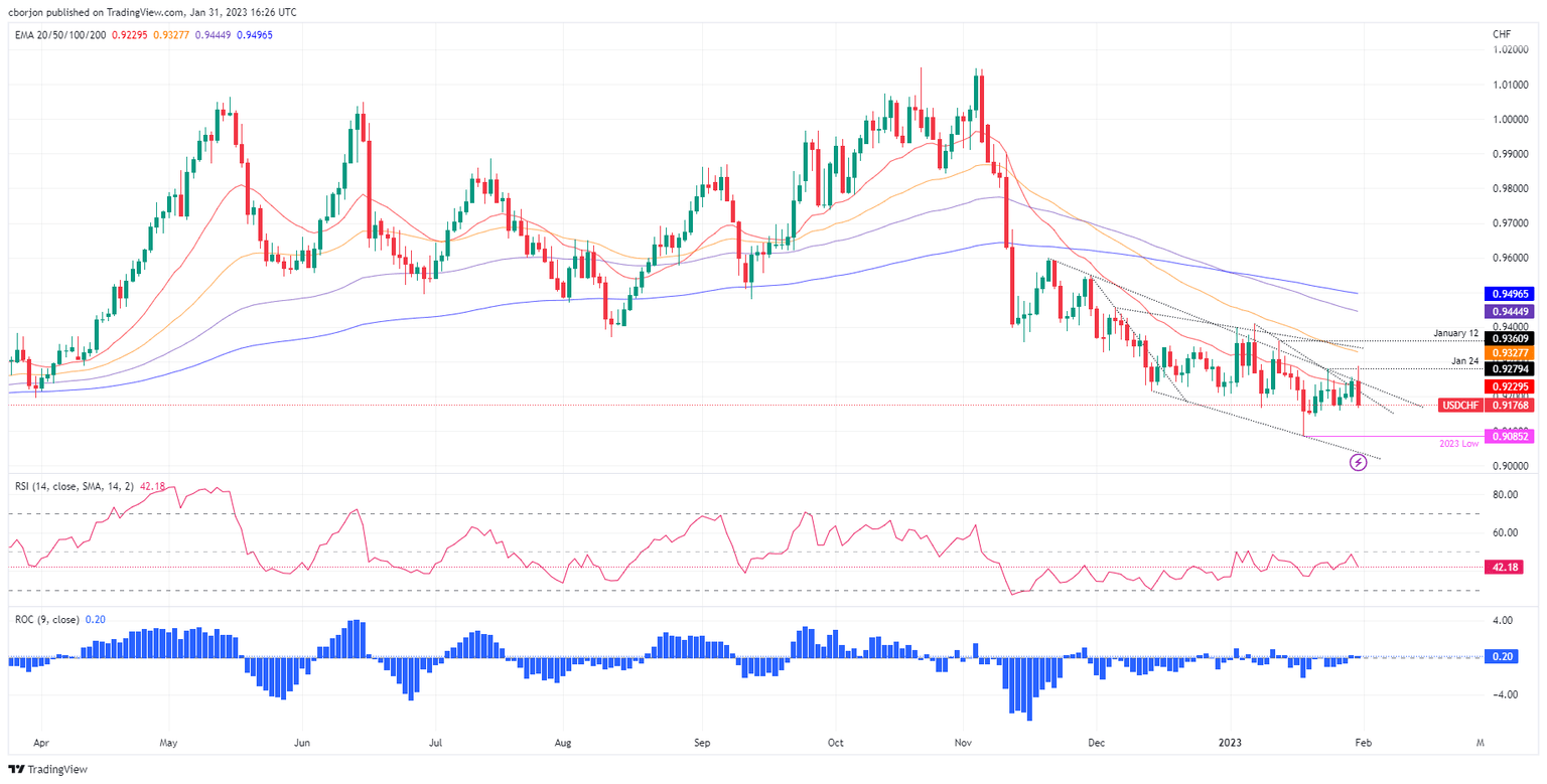 USD/CHF Price Analysis: Rejected at 0.9280s, falls beneath the 20-DMA and 0.9200