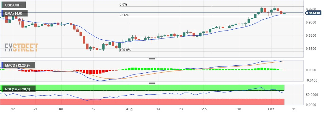 On the downside, the 14-day Exponential Moving Average (EMA) at 0.9113 emerges as the immediate support, followed by the 0.9100 psychological level. A break below the level could direct the bears of the pair to reach the 23.6% Fibonacci retracement at 0.9081 level.
