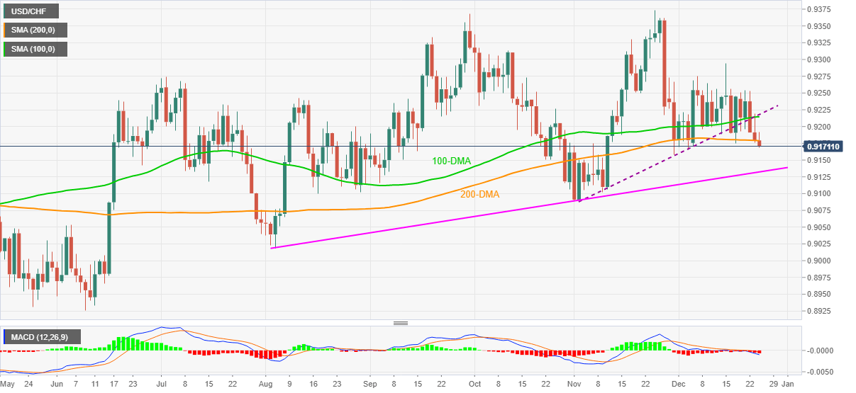 The Swiss currency (CHF) pair’s latest loss could be linked to the clear downside break of the 200-DMA. Also adding to the bearish bias are the downbeat MACD signals and sustained trading below 0.9215 support-turned-resistance confluence including 100-DMA and an upward sloping trend line from November 01.