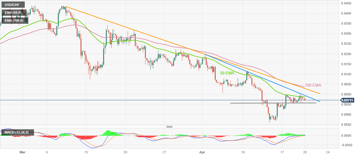 Meanwhile, an upside break of the 50-EMA hurdle of 0.8987 isn’t a blockbuster ticket for the USD/CHF buyers as a 13-day-old descending trend line and a downward-sloping trend line from early March, respectively near 0.8995 and 0.9030, could challenge the upside moves.