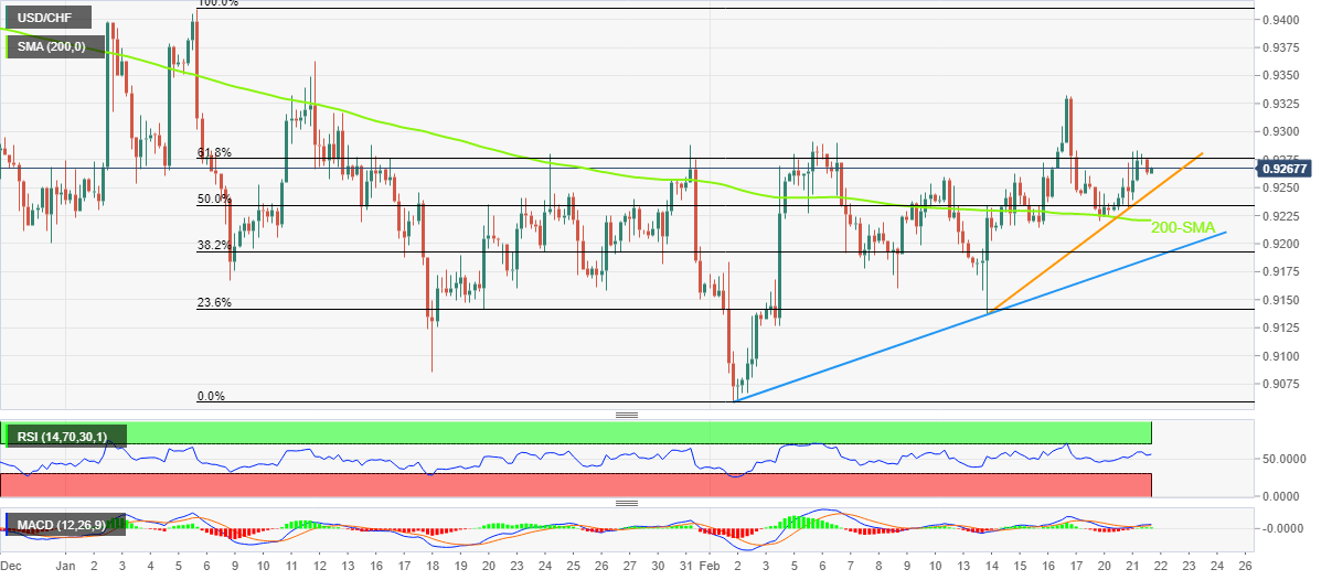 It’s worth noting that an upward-sloping support line from February 01, close to 0.9185 at the latest, appears the last defense of the USD/CHF bulls.