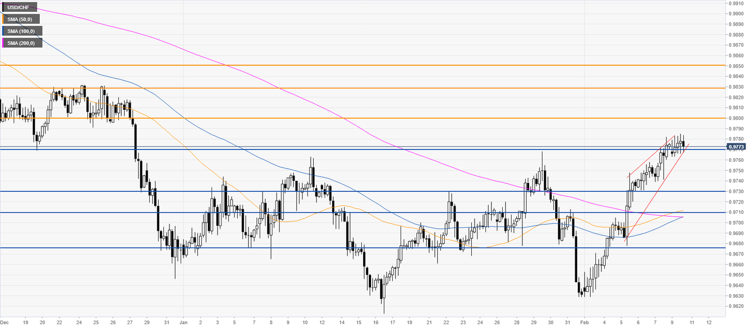 USD/CHF is trading in a rising wedge pattern suggesting the market might be exhausting itself. If the bears break the 0.9770 support on a daily basis, the spot could decline towards the 0.9730 and 0.9710 price levels. On the flip side, if the buyers surpass the 0.9800 figure the quote could continue trending to the upside towards the 0.9830/50 levels.