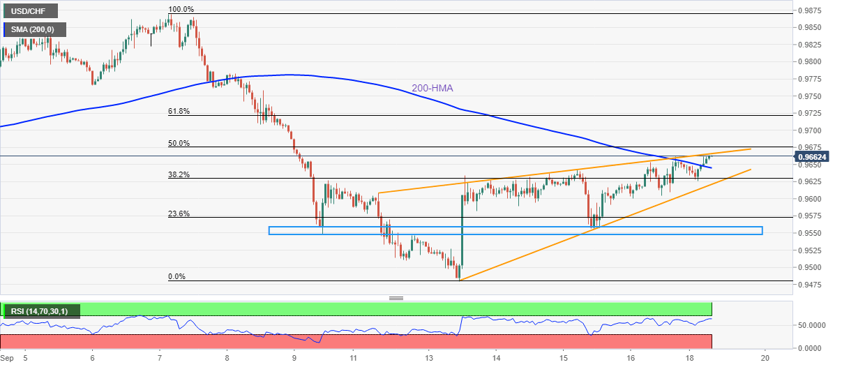 USD/CHF rises to a one-week high of around 0.9660 heading into Monday’s European session. In doing so, the Swiss currency (CHF) pair picks up bids inside a one-week-old rising wedge bearish formation.