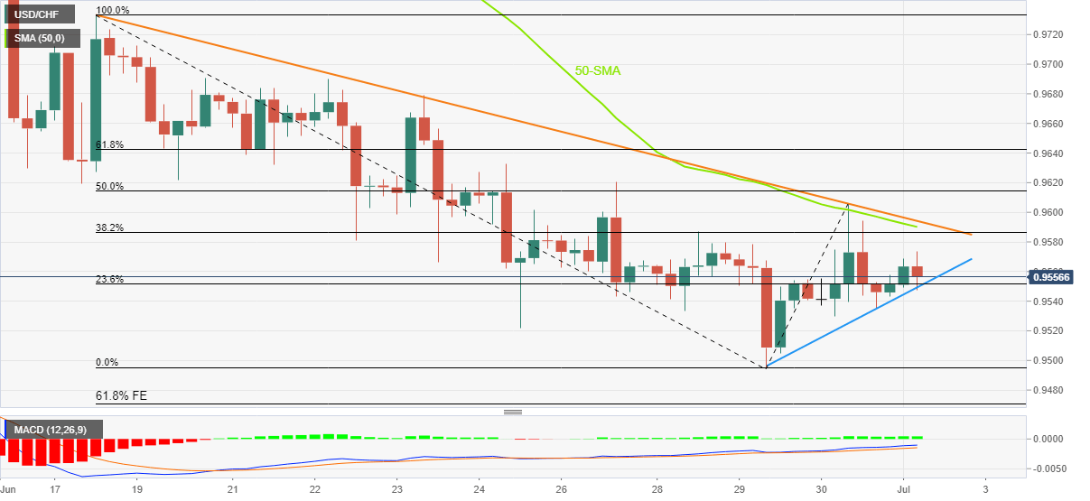 USD/CHF pares intraday losses around 0.9550 heading into Friday’s European session. In doing so, the Swiss franc (CHF) pair pokes a two-day-old support line by the press time.