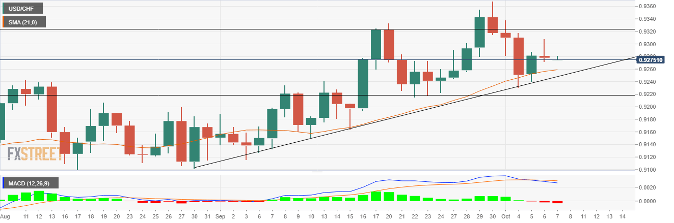 Having said that, if the price sustains below the intraday low, it could immediately test the 21-day Simple Moving Average (SMA) at 0.9258. The Moving Average Convergence Divergence (MACD) trades in the overbought zone with stretched buying conditions. Any downtick in the MACD would amplify the selling opportunities in the pair. The bears could test the 0.9220 horizontal support level, followed by the low made on September 15 at 0.9163.