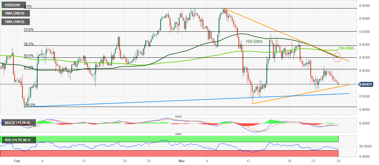USD/CHF remains depressed around 0.9150 as it keeps the week-start fall amid Tuesday’s sluggish Asian session. In doing so, the Swiss Franc (CHF) pair justifies the looming bear cross on the MACD indicator, as well as the downbeat RSI (14) line.