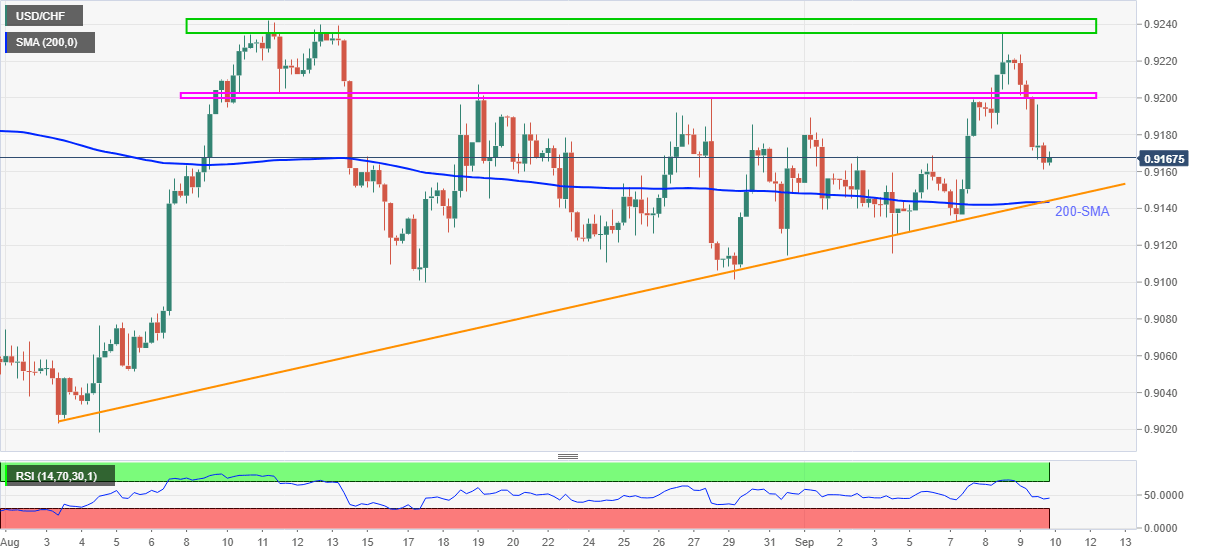 USD/CHF remains on the back foot around 0.9165, down 0.05% intraday during Friday’s Asian session.
