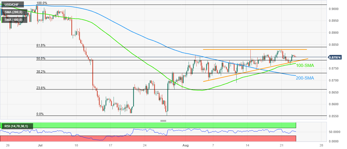 USD/CHF languishes around 0.8800 as it fades the previous day’s rebound from the 100-SMA heading into Wednesday’s European session. In doing so, the Swiss Franc (CHF) pair portrays the market’s cautious mood ahead of the preliminary readings of the August month Purchasing Managers Indexes (PMIs) for the US.