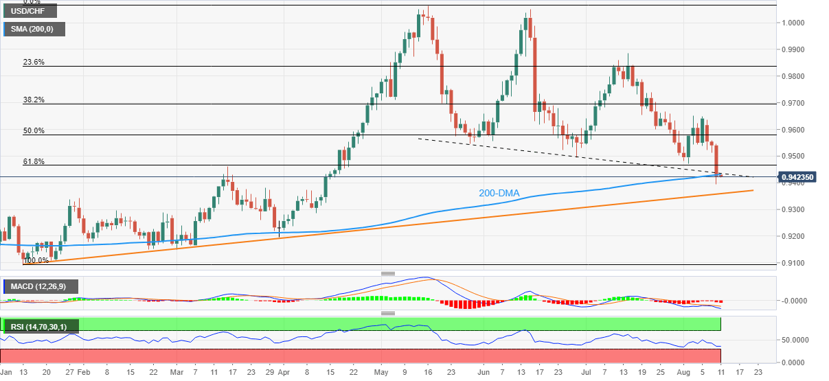 USD/CHF licks its wounds at the lowest levels since mid-April, taking rounds to 0.9420-25 during Thursday’s Asian session.