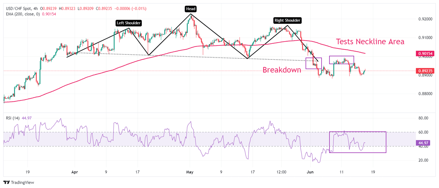 - USD/CHF tests the breakdown region of the H&S pattern.