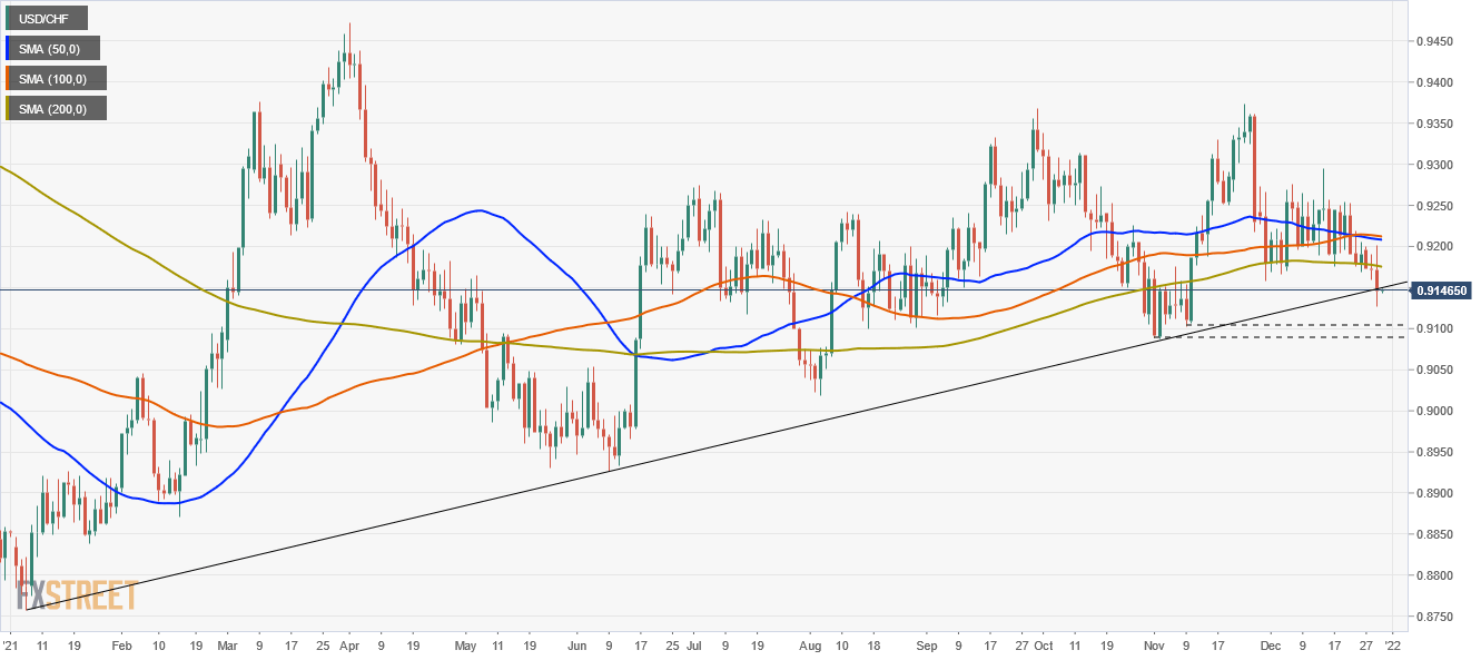 USD/CHF Price Analysis: The break below the 200-DMA opens the door for bears eyeing 0.9100