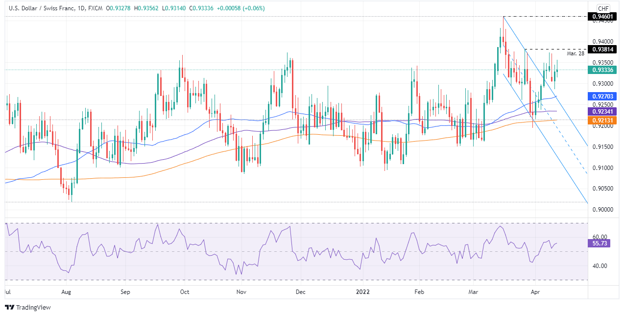 Upwards, the USD/CHF’s first resistance would be the March 28 daily high at 0.9381. A breach of the latter would expose the psychological 0.9400 level, followed by the YTD high at 0.9460. On the downside, the USD/CHF first support would be 0.9300. A decisive break would expose the 50-day moving average (DMA) at 0.9270, followed by the 100-DMA at 0.9234 and the 200-DMA at 0.9213.